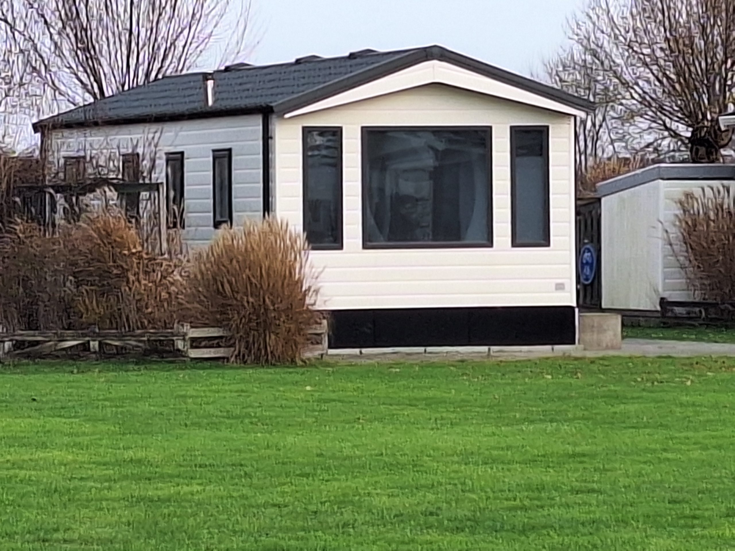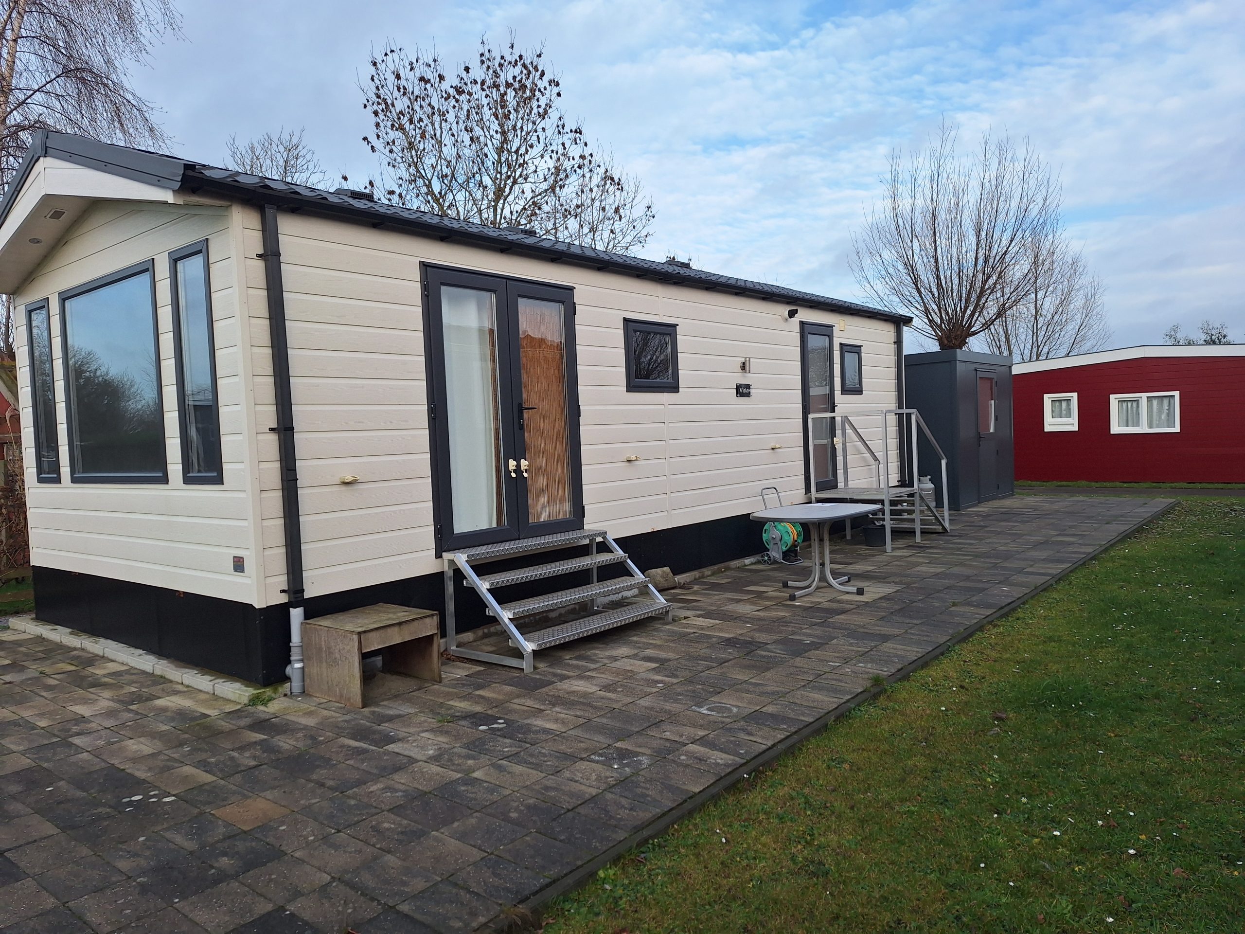 Materialen: de zijwanden zijn van kunststof; kozijnen, deur en openslaande deuren zijn eveneens van kunststof, allemaal voorzien van dubbele beglazing; het dak is geïsoleerd en gedekt met dakpanplaten; Tevens is het chalet voorzien van centrale verwarming, een pallet kachel en een nieuwe internet aansluiting met router.