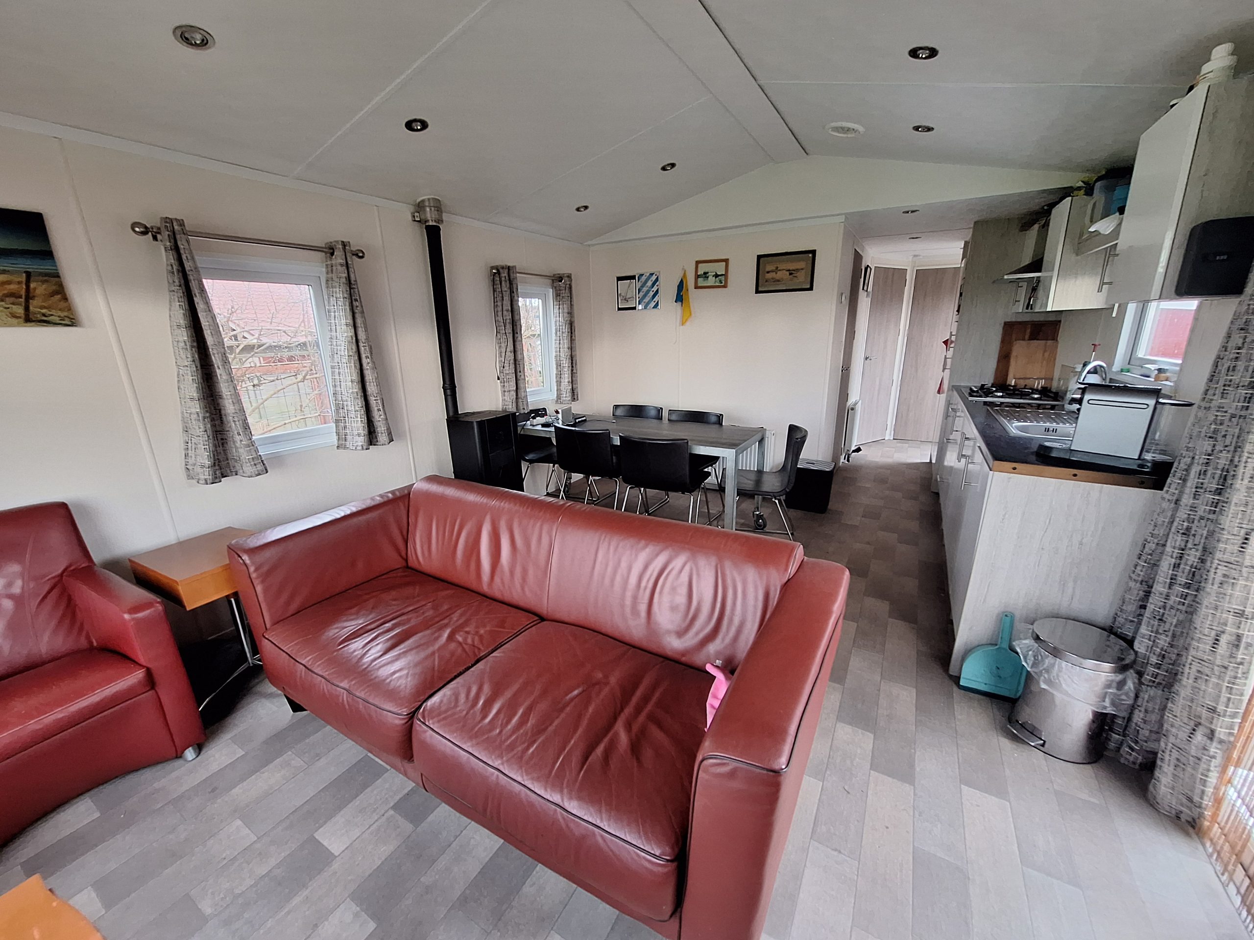 De woonkamer met een zithoek en een keukenblok voorzien van gastoestel, koelkast en vaatwasser;