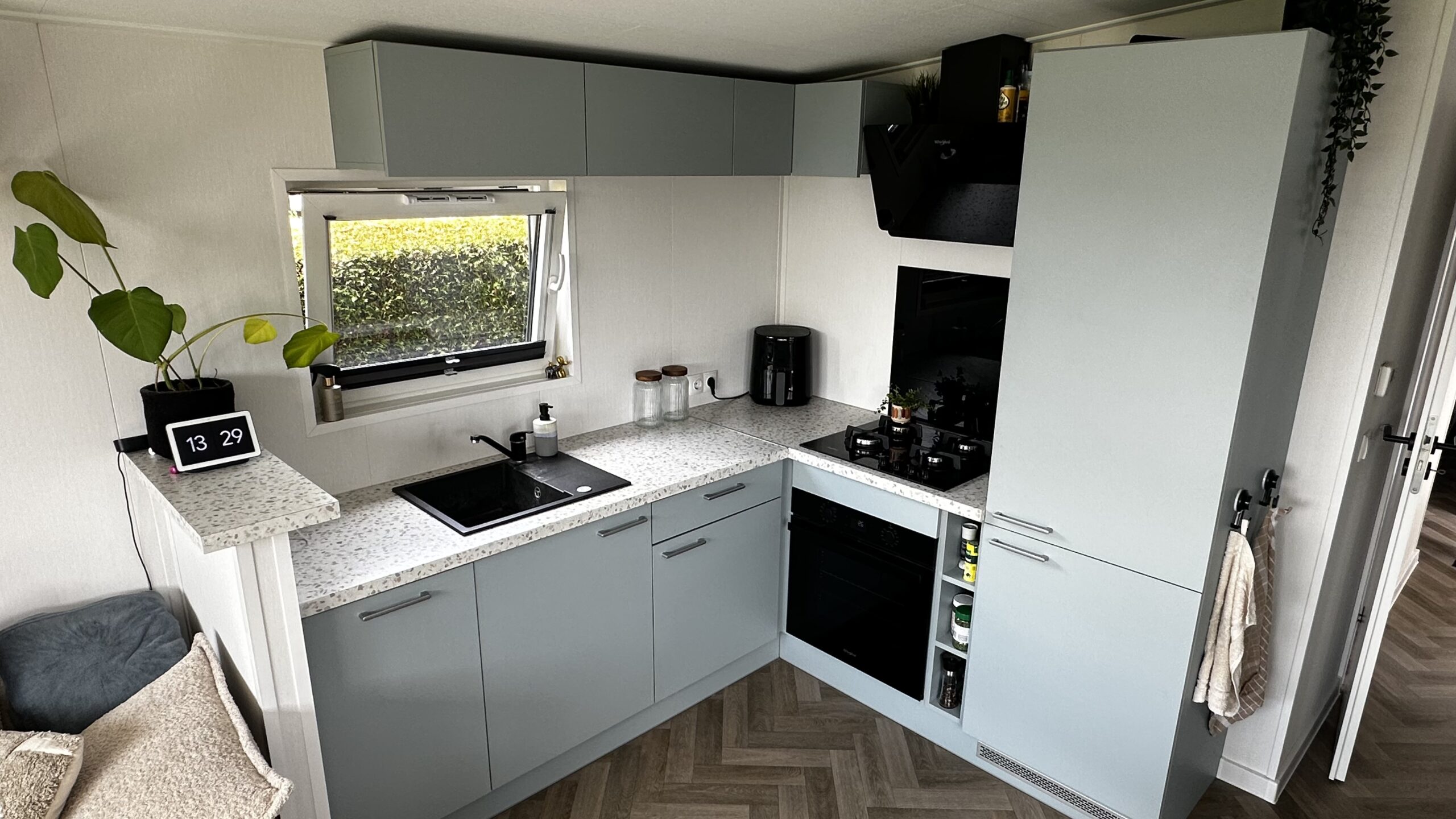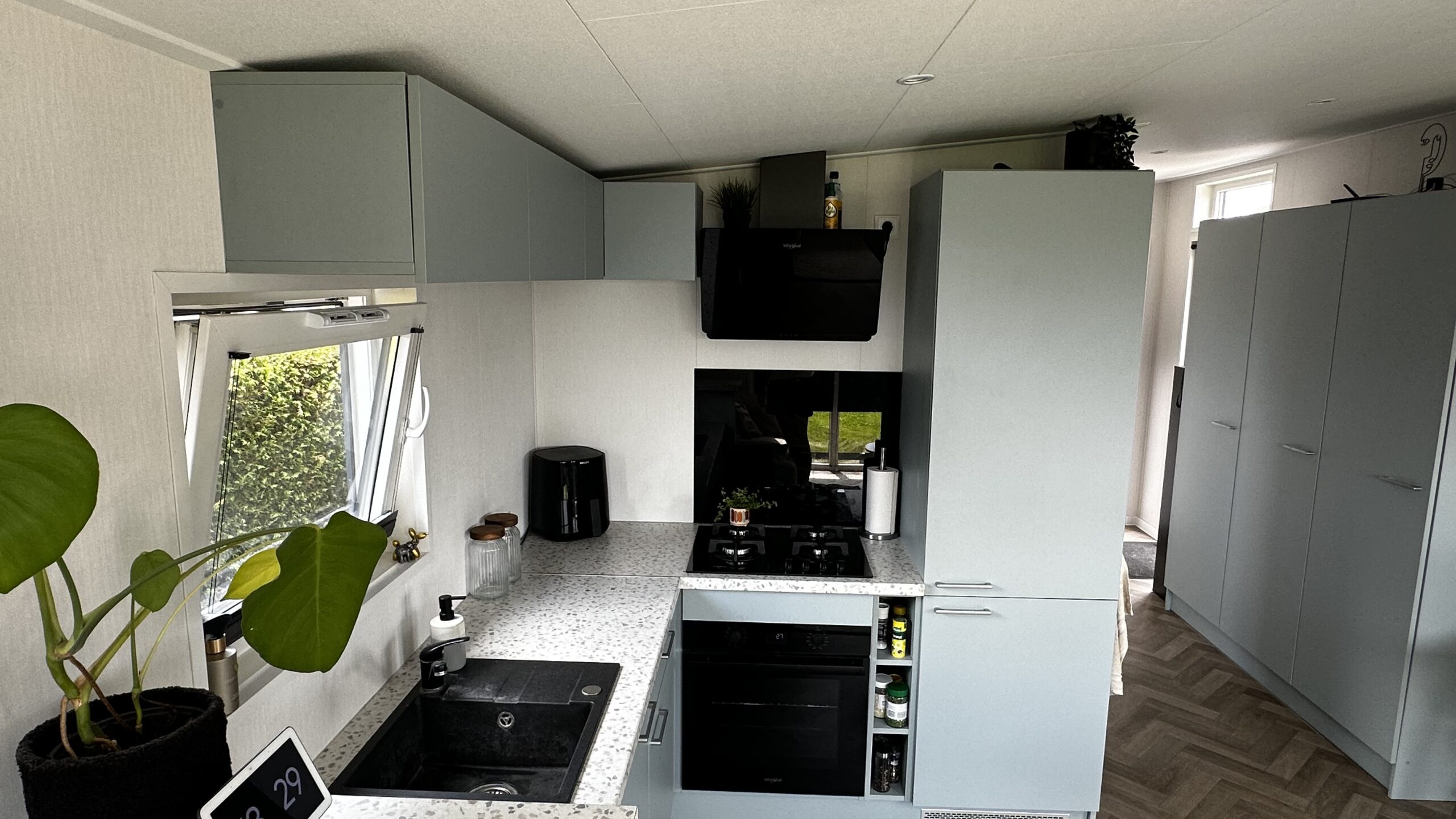 het keukenblok is voorzien van oven, 4-pits gastoestel met wasemkap,