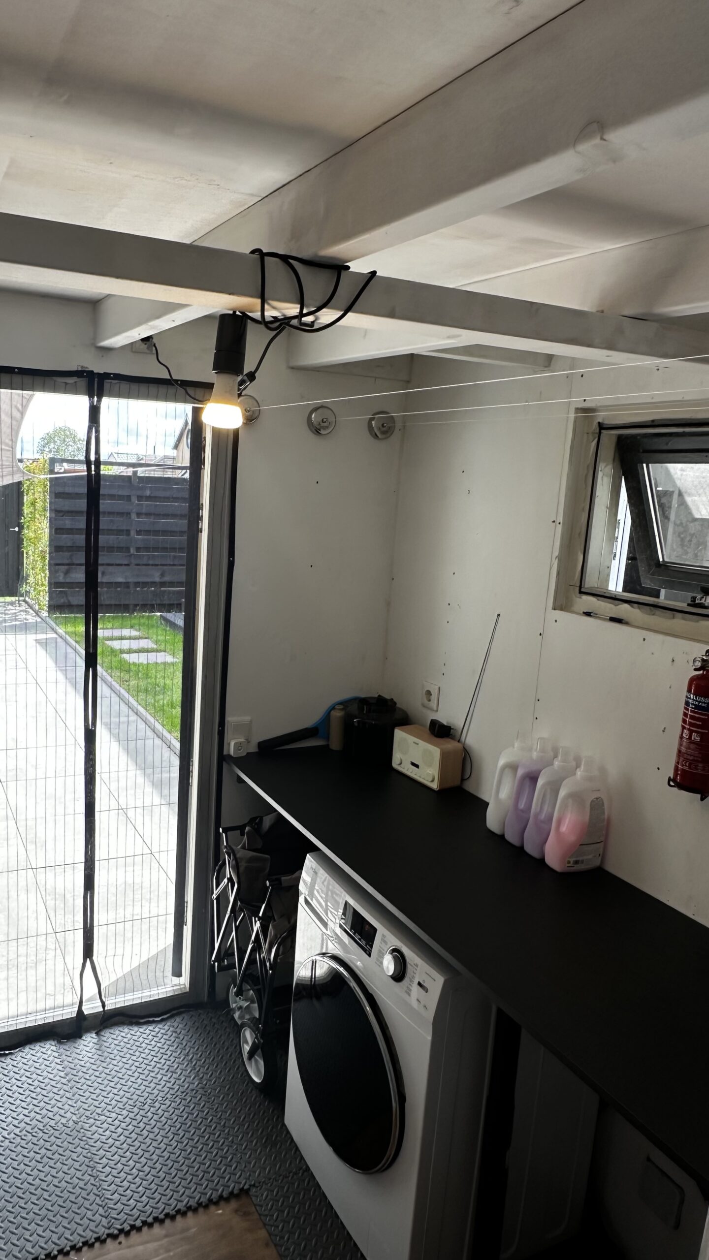 Zitbank woonkamer, eettafeltje, ronde spiegel, boxspring 2.10×1.40 cm grote slaapkamer, 2x 1 persoonsbedden, wasmachine, schaduwdoek, alle tuingereedschap.
